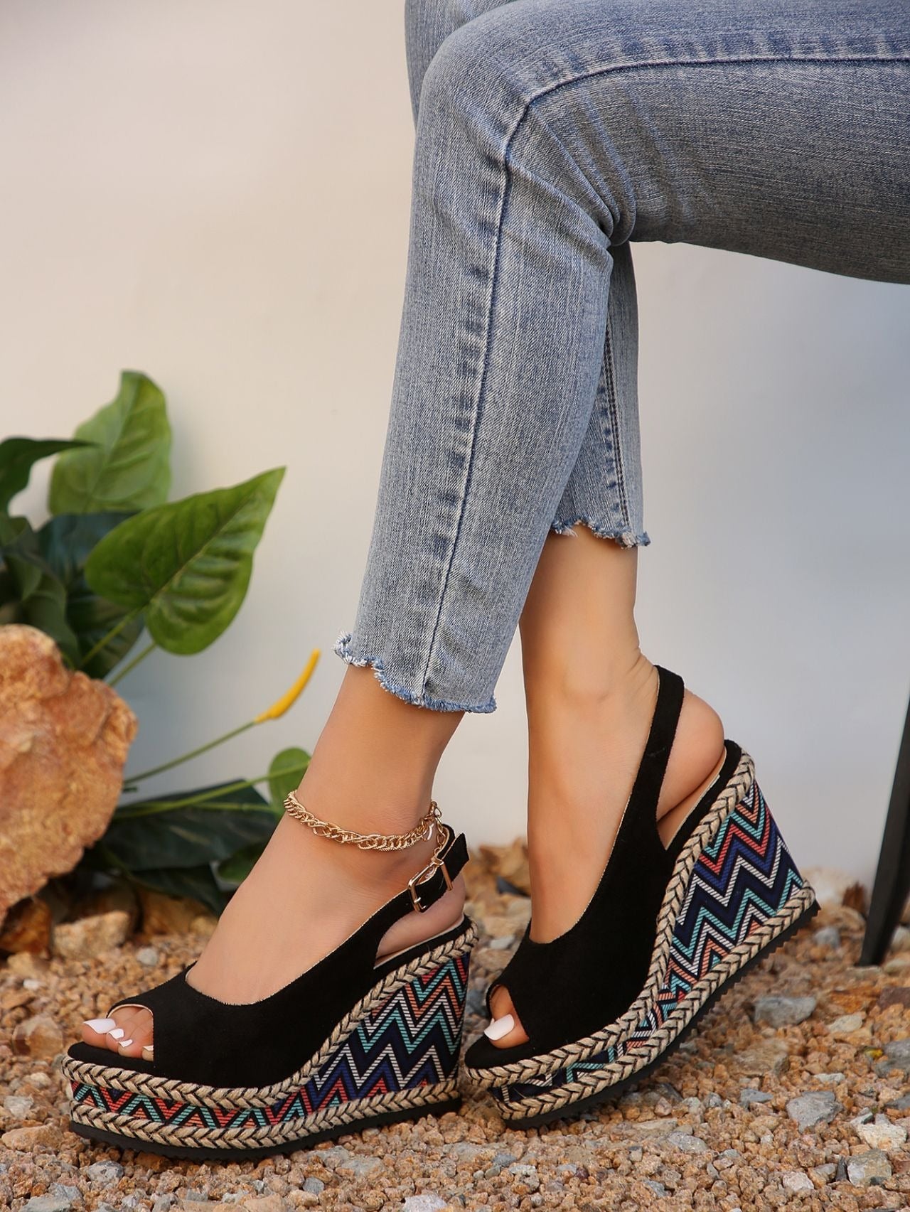 Conçues pour rehausser votre style grâce à un savoir-faire contemporain, ces sandales compensées pour femmes offrent un mélange parfait de confort et de caractère visuel. Le talon compensé doublé d'un tissu ethnique en zigzag ajoute de la hauteur et de l'éclat, tandis que les lanières en daim souple avec fermeture à boucle réglable offrent un soutien sûr et une finition sophistiquée.