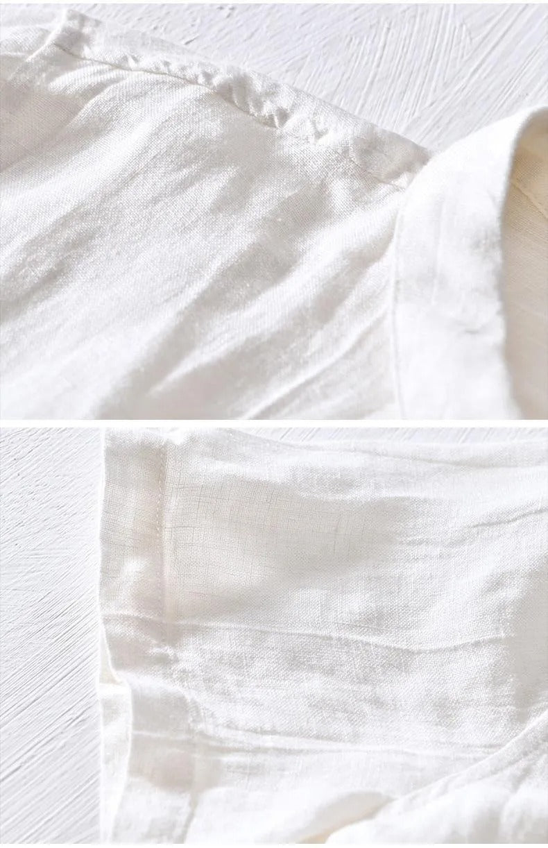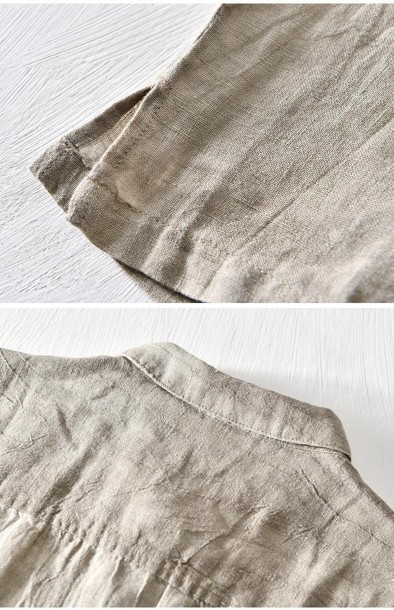 Le design à manches courtes, avec un col ouvert et une patte de boutonnage, lui confère une touche décontractée sans perdre la structure d'un vêtement de caractère. Le tissu de lin lui confère une texture unique et un drapé doux qui rehaussent son style simple et sophistiqué.