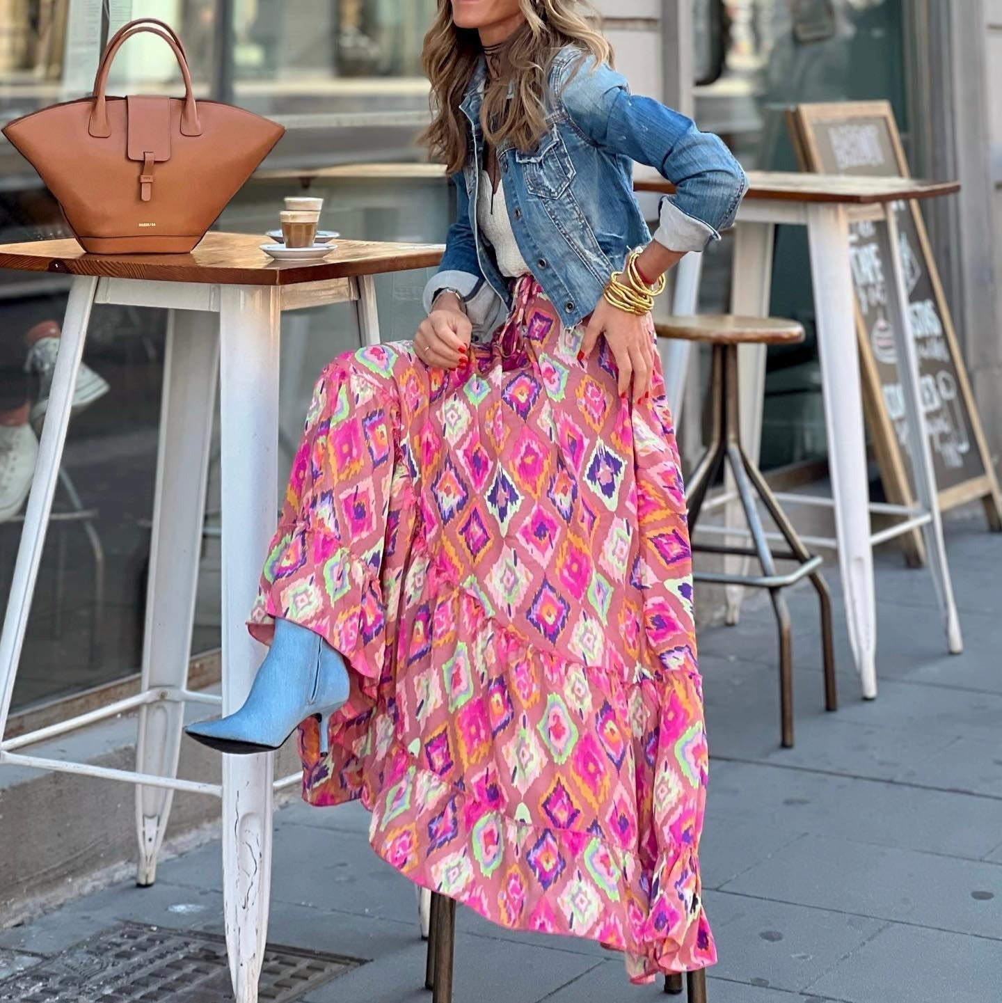 Jupe longue d'inspiration bohème avec un imprimé paisley audacieux dans des teintes vibrantes. Confectionnée dans un tissu fluide, son drapé naturel et ses volants apportent mouvement et fraîcheur à chaque pas.