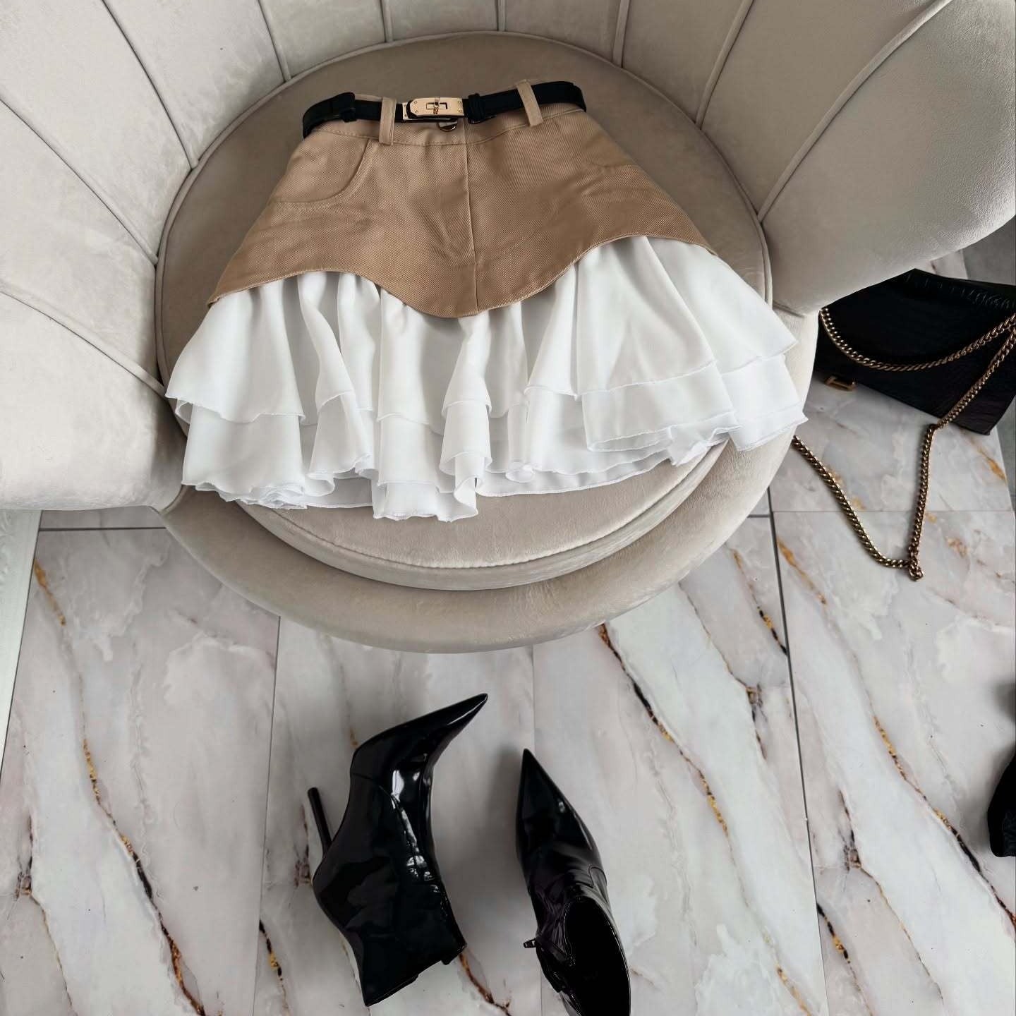 Une fusion audacieuse de styles et de textures. Cette mini-jupe présente une ceinture structurée en denim avec des poches sur le devant, contrastée par un bas de jupe plissé et volanté en tissu fluide. La ceinture intégrée apporte une finition soignée, tandis que le motif superposé offre volume et mouvement. Idéale pour les looks urbains avec de la personnalité, elle s'associe parfaitement avec des bottes, des tops ajustés ou des chemises surdimensionnées.