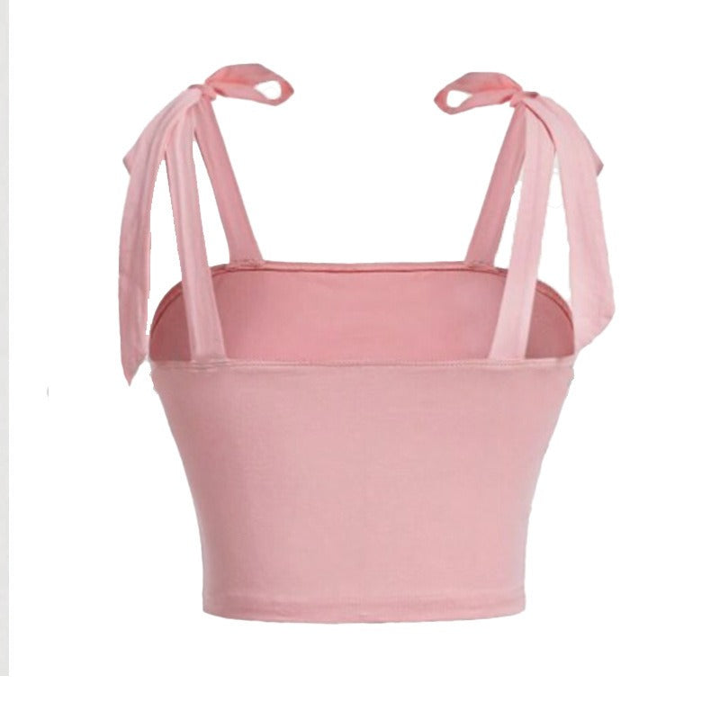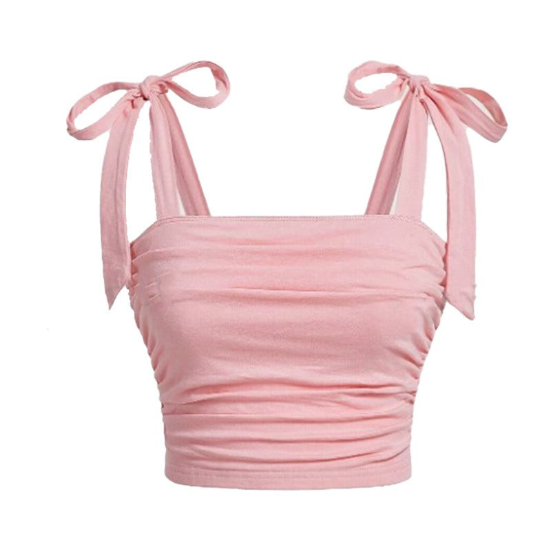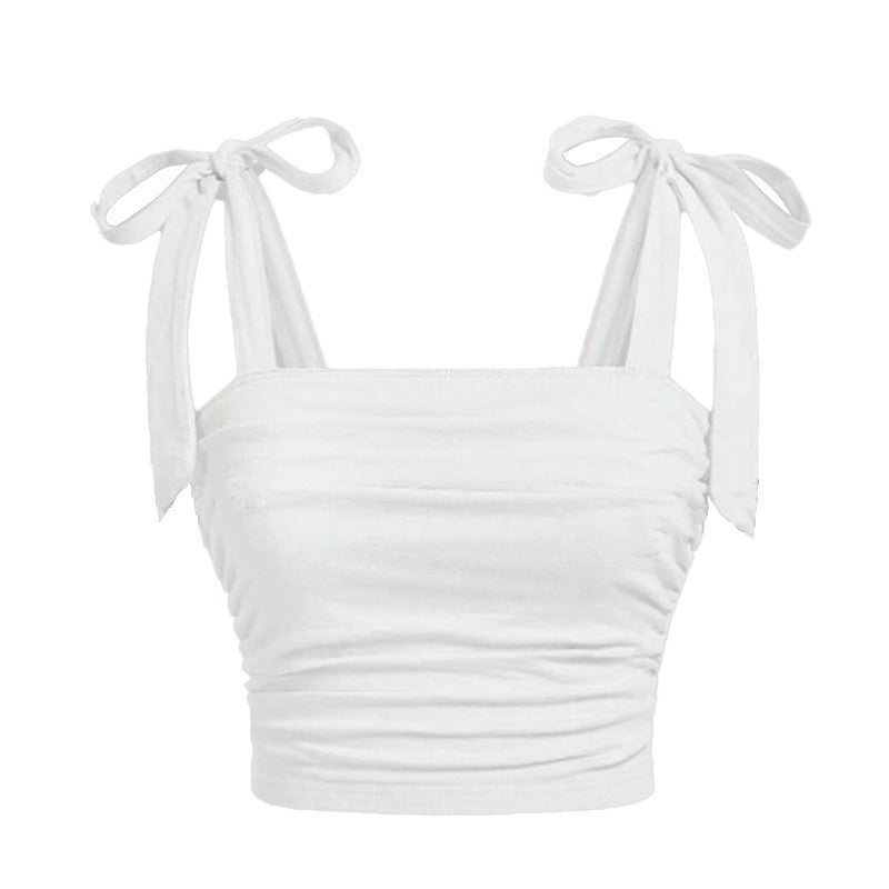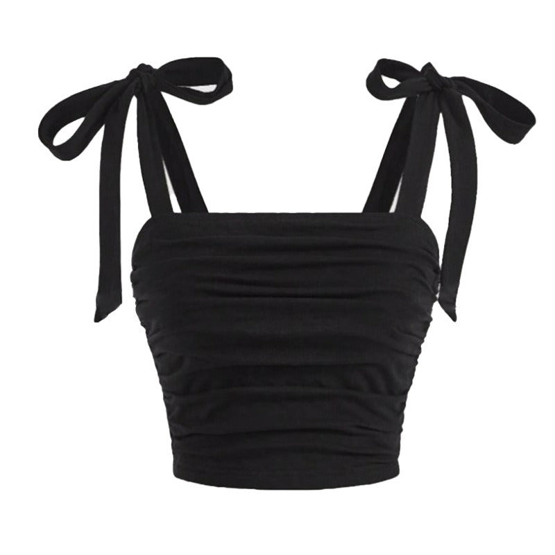 Top court à encolure droite et longues bretelles réglables avec un nœud sur les épaules. Sa maille douce et ses fronces lui confèrent une coupe flatteuse et confortable pour les jours les plus chauds.
